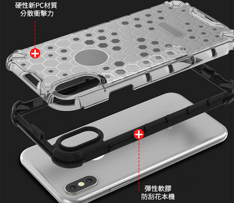 雙層防摔鋒甲殼具有雙層複合式材料的結構計定,內層為軟性TPU 材質結構和外層硬PC 防護結構。內層防護結構負責主要有吸震、抗外力效果,而外層防護結構則負責減少外界的震動對內部結構的影響。