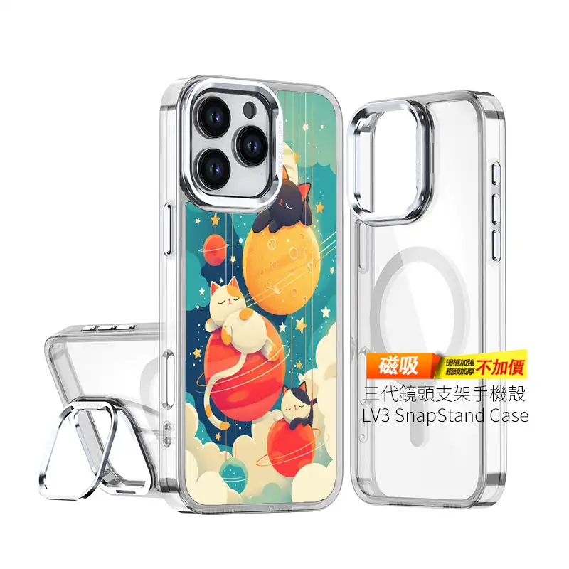 暖黃與湖藍交織的星空裡,三隻小貓趴在行星上熟睡:一隻在月面打盹、一隻在紅色行星上抱著環、一隻縮在小行星上喵喵作夢。喵喵行星小憩 C165 採用 四角加強空壓透明殼+UV 高解析直噴,卡通線條銳利、色彩飽和持久;支援多機型與 MagSafe 選配。