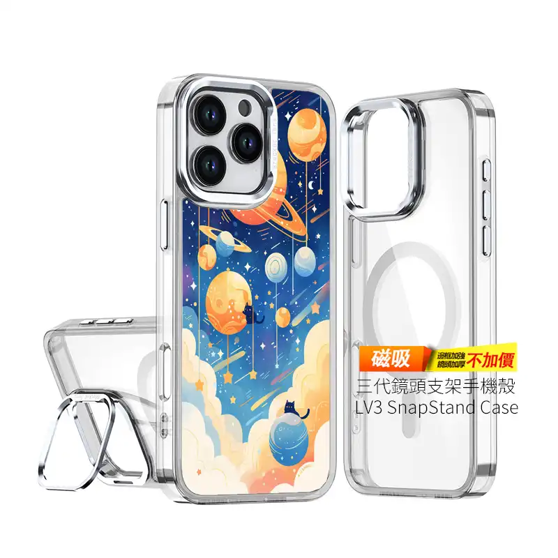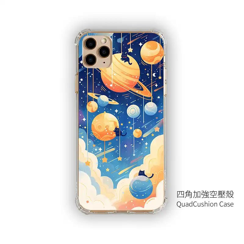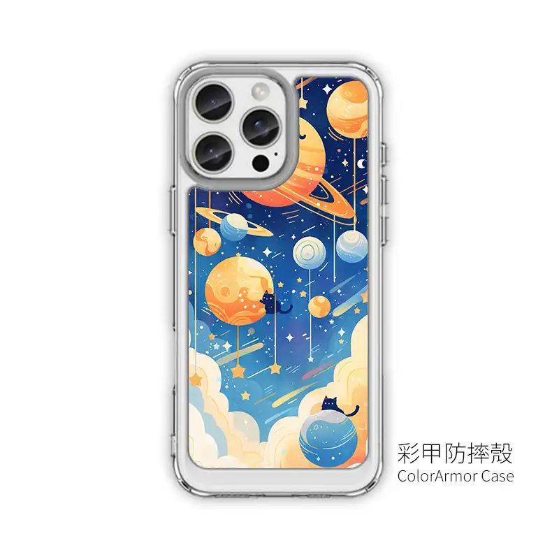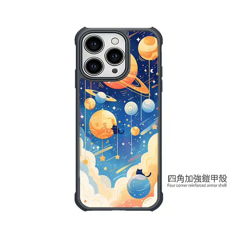藍金星空裡掛滿行星與流星,小貓坐在藍色星球抬頭望月;暖橘行星與雲海把夜色點亮。喵遊星海 C167 採 四角加強鎧甲殼(高透 PC 背板+韌性邊框、四角強化) 與 UV 高解析直噴,卡通線條銳利、色彩飽和耐久;支援多機型與 MagSafe 選配。