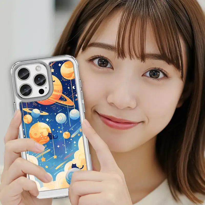 UV 高解析印刷:行星環、垂墜星星與小貓剪影層次分明,長期使用不易掉色。