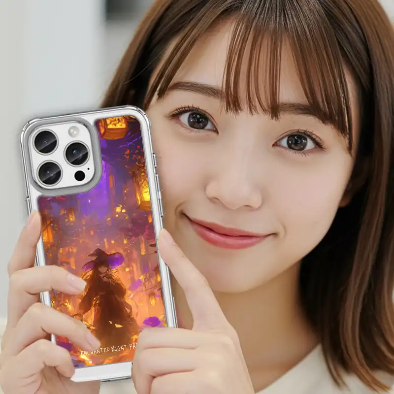 在橘紫交錯的街燈下,魔女踏過花燈與微風,點亮整條幻夜街道。幻燈街祭 GR023 採用 四角加強空壓殼(QuadCushion)UV 高解析印刷,以黃金與紫光交織的層次呈現宛如動畫場景的夢幻夜色。
