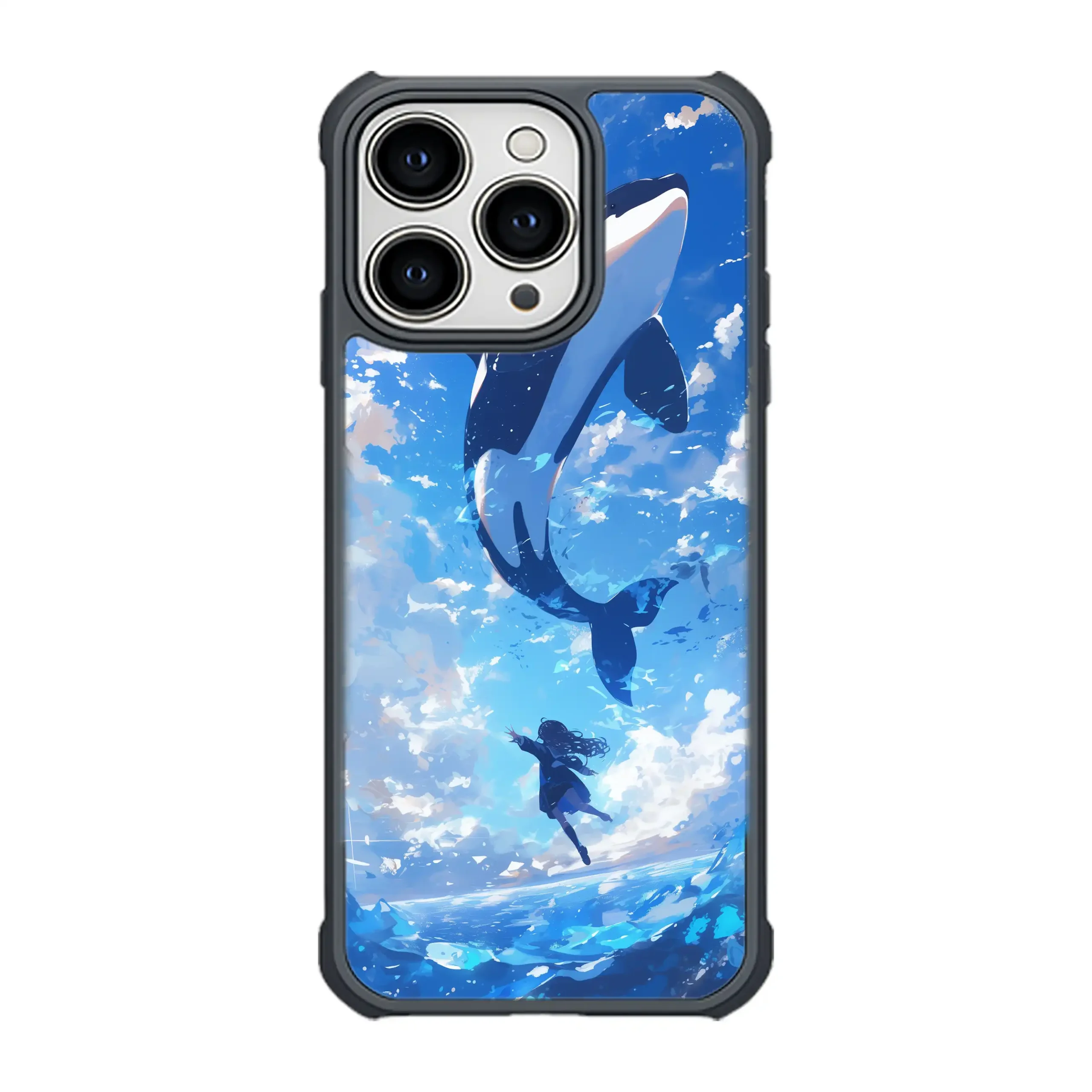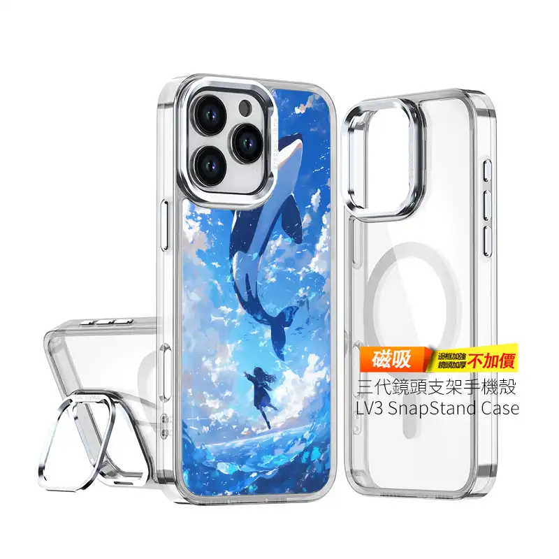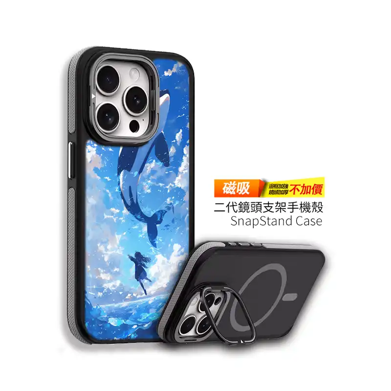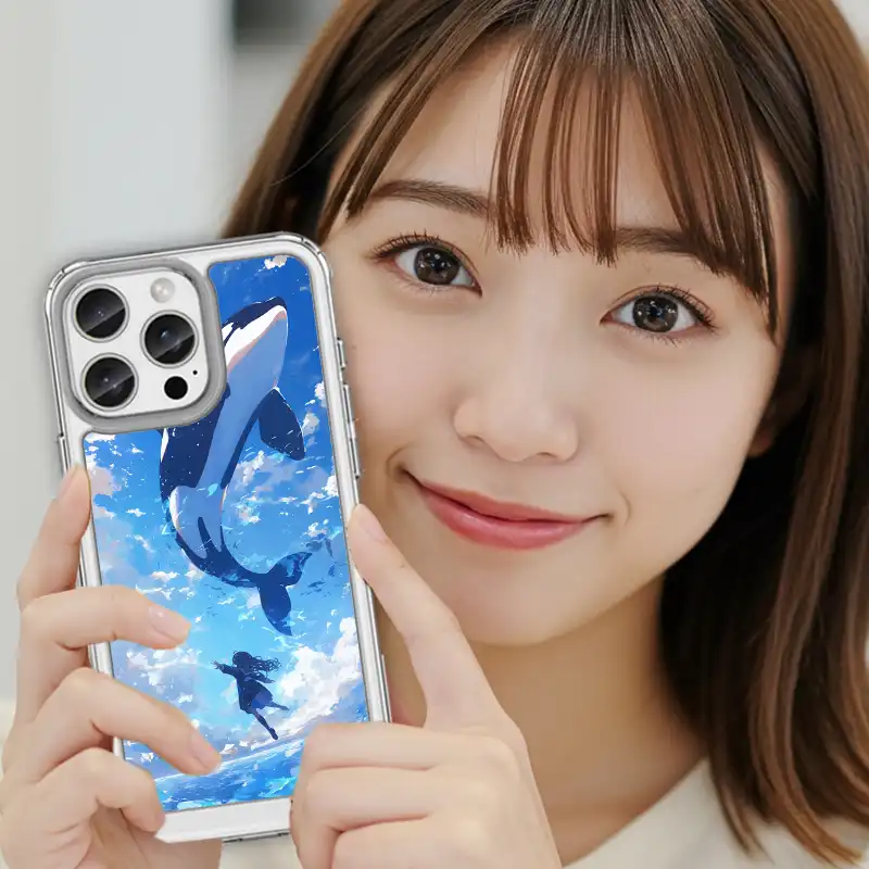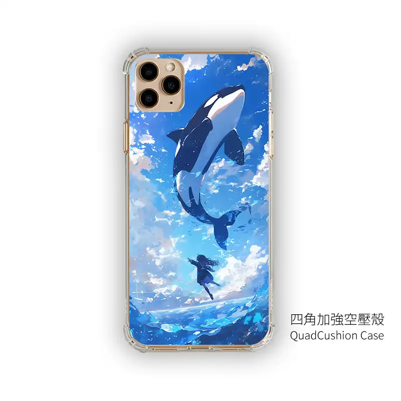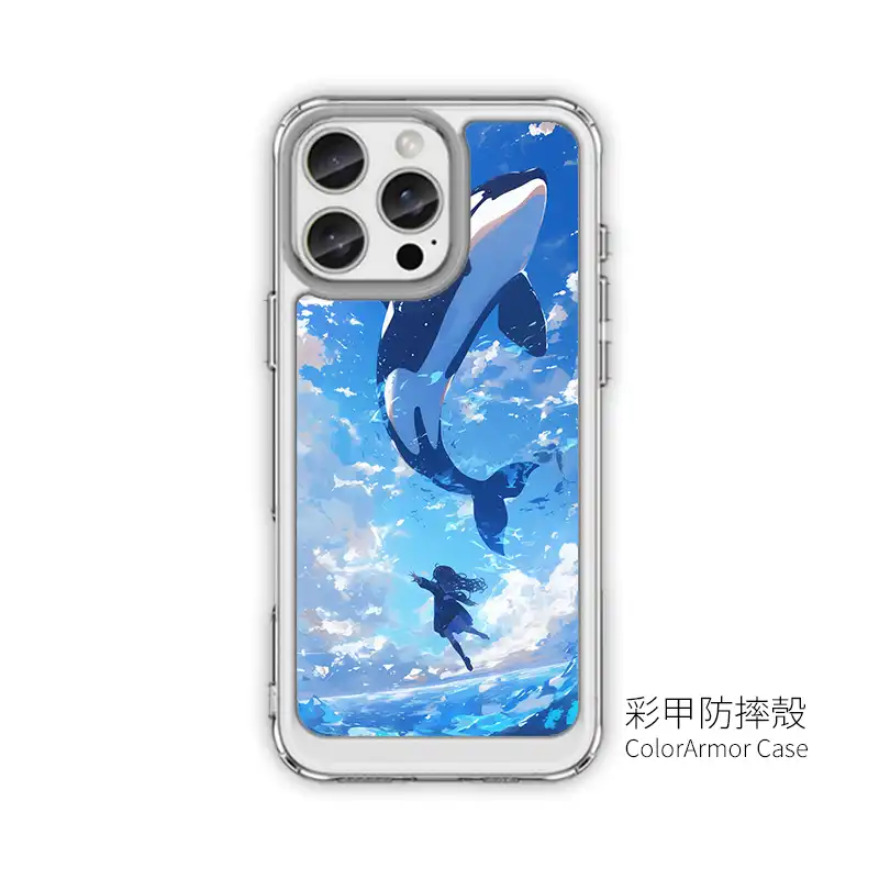 藍天白雲在海面翻湧,虎鯨自浪尖躍起,少女向上伸手回應;光與水在掌心交會。天穹躍鯨 L096 以清亮藍白筆觸呈現夏日冒險感,搭配 彩甲防摔外框(面硬側軟、四角加厚) 與 UV 高解析直噴,你的照片/插畫/題字都能銳利、耐久地被看見。