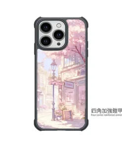 PC 高硬度背板,街景插畫線條與櫻花細節不易被刮傷