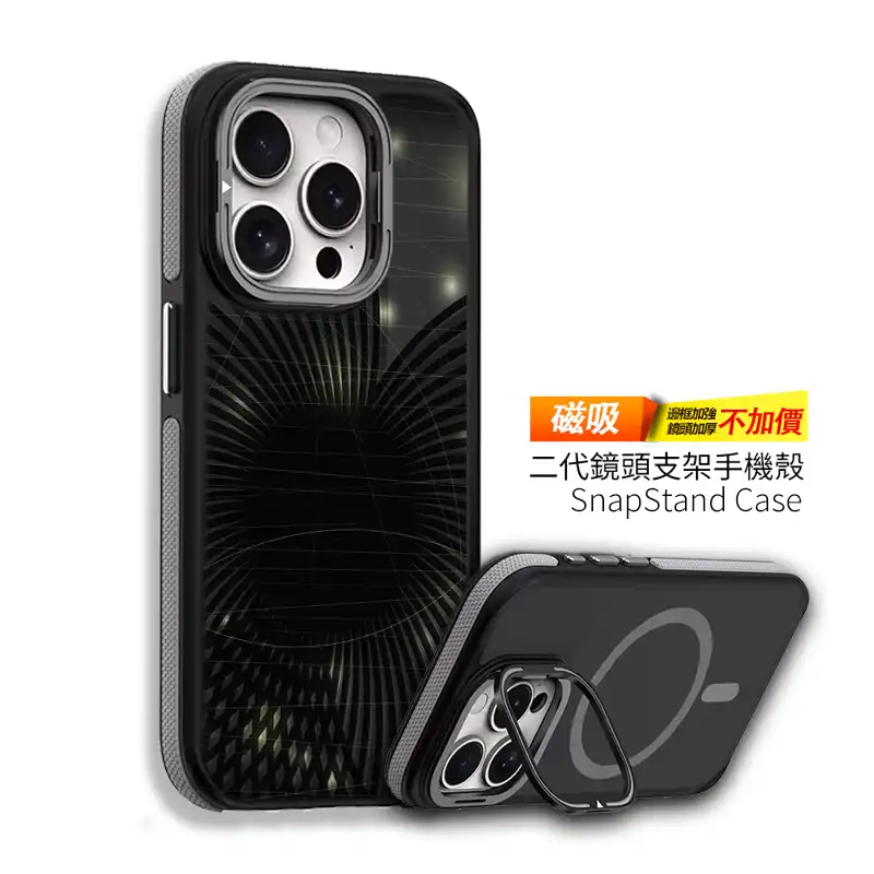 設計靈感:源自日常使用需求,將「鏡頭保護」與「可收納支架」結合,當鏡頭保護蓋掀起時,即化身為三角形穩固支架,輕鬆釋放雙手,無論追劇、視訊會議或自拍都能隨心調整角度。